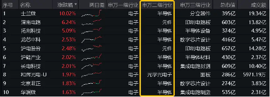 或由于芯片巨头AMD、三星电子业绩亮眼,隔夜英伟达狂拉12.81%,台积电飙涨7.29%,美股芯片股的涨势今日(8月1日)传递至A股市场,半导体涨势红火,电子50指数涨幅前10大成份股中,半导体个股占据7席,其中,士兰微涨停封板,登顶Wind人气榜榜首,拓荆科技涨超5%,龙芯中科、沪硅产业、长电科技涨逾2%。