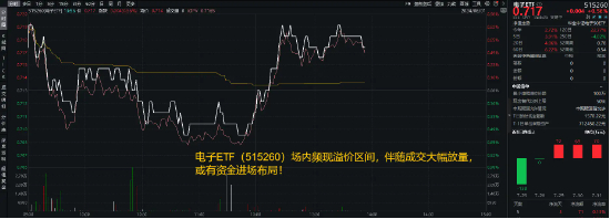 热门ETF方面,覆盖半导体芯片和苹果产业链的电子ETF(515260)午后发力上攻,场内价格盘中上探0.84%,现涨0.56%,场内频现溢价区间,伴随成交大幅放量(实时成交额超2600万元),或有资金进场布局!