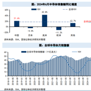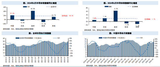分地区来看,今年6月中国和美洲地区销售额同比增速分别为+21.6%、+42.8%,高于全球平均增速;日本、欧洲和其他地区同比增速分别为5.0%、-11.2%、+12.7%,低于全球平均增速。24Q2中国的半导体销售额为453亿美元,占全球的30.2%。