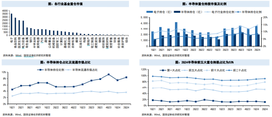 基金持仓方面,24Q2基金持续超配于半导体行业,但持仓集中度有所下降。据国信证券统计,24Q2基金持有半导体公司市值2,022亿元,持股比例为8.4%,环比提升0.9pct;相比于半导体行业的流通市值3.6%超配了4.8pct。集中度方面,前五大重仓股占比较上一季度下降1.3pct,第一大重仓股(中芯国际)环比降1.9pct。(提及具体公司仅为说明行业观点不构成投资建议,下同)