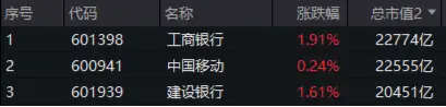 成份股方面,工农中建交五大行股价续创历史新高!其中,工商银行总市值超越中国移动,重登A股市值“一哥”,建设银行总市值突破2万亿元大关,居A股第三。截至收盘,在A股仅有的3只2万亿市值“巨无霸”中,银行股占了2席。