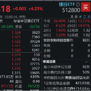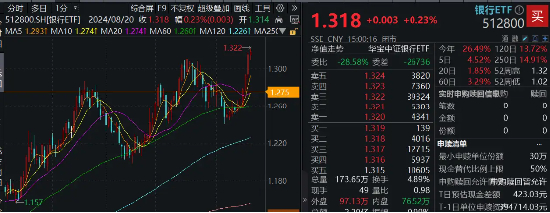 今日银行股继续逆市走强,A股顶流银行ETF(512800)场内价格收涨0.23%,喜提日线6连阳,盘中最高价上探1.322元,刷新2017年8月3日上市以来新高。
