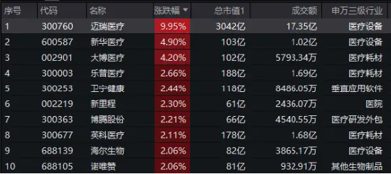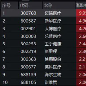 30日早盘,器械巨头迈瑞医疗跳空高开,一度飙涨超10%,总市值回归3000亿上方!医疗板块全线提振,中证医疗指数50只成份股中超40股飘红,新华医疗、大博医疗、乐普医疗等器械股大幅跟涨。