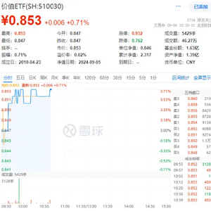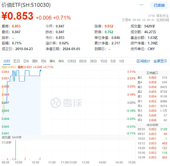 今日(9月6日),高股息再续强势,聚焦“高股息+低估值”大盘蓝筹股的价值ETF(510030)开盘后迅速上扬,截至10:40,场内价格涨0.71%。