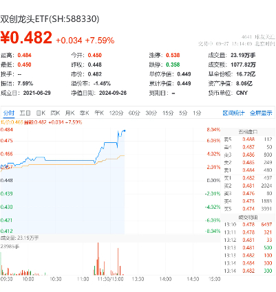 涨疯了!今日(9月27日),创业板指涨超11%,创历史最大涨幅!科创50指数亦涨超7%,覆盖创业板和科创板龙头个股的双创龙头ETF(588330)临近中午快速发力猛攻,场内价格现涨7.59%!