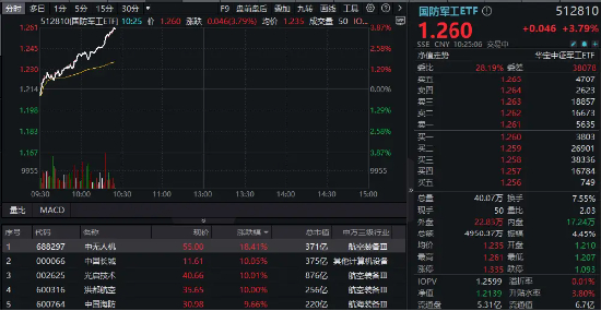 表征国防军工板块整体行情的国防军工ETF(512810)盘中冲击4%,截至发稿涨3.79%!