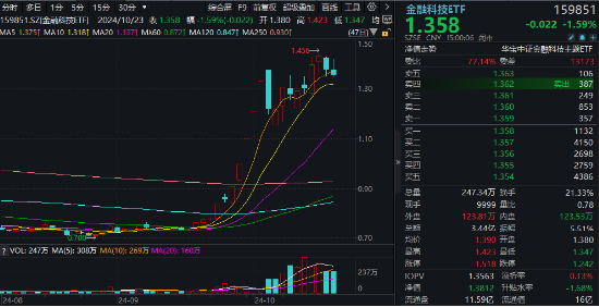 热门ETF方面,金融科技ETF(159851)场内冲高回落,早盘摸高涨逾3%,午后下挫收跌1.59%。全天振幅超5%,换手率超21%,成交额达3.44亿元,交投维持高度活跃!