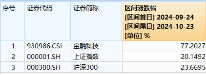 复盘来看,近期相关事件、题材连番引爆,金融科技指数近1月仍有亮眼增幅!Wind数据显示,自9月24日市场行情启动以来,截至10月23日,金融科技ETF(159851)标的指数区间涨幅仍高达77%,同期上证指数、沪深300指数则分别上涨20.15%、23.67%,依旧大幅领跑市场。