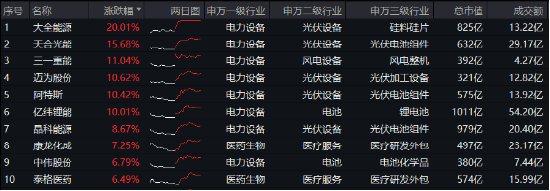 今日成长风格大反攻,创业板指一度涨超4%,科创50指数盘中涨逾3%,覆盖创业板+科创板高成长龙头的科创创业50指数亦有亮眼表现。从行业层面看,电力设备领涨两市,光伏无疑成为“最靓的仔”,大全能源早盘封于涨停,天合光能涨超15%,迈为股份、阿特斯均联袂涨逾10%。