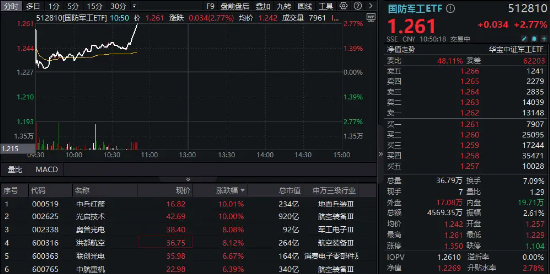 表征国防军工板块整体行情的国防军工ETF(512810)盘中直线拉涨,截至发稿场内涨2.77%。