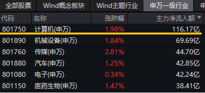 资金面上,主力资金大举涌入计算机板块,Wind数据显示,计算机板块全天获主力资金净流入116.17亿元,霸居31个申万一级行业首位