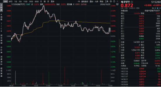 热门ETF方面,一基双拼“消费电子+半导体” 的电子ETF(515260)早盘震荡上扬,场内价格最高上探2.54%,后随市盘整走弱,仍顽强收涨0.69%,成功斩获日线4连阳!
