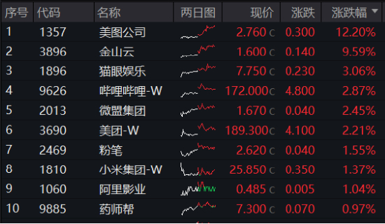 受隔夜中概股强劲表现提振,科网龙头早盘集体拉升,午后受大盘整体回落影响走势分化,截至收盘,哔哩哔哩涨近3%,美团涨超2%,小米集团涨逾1%,腾讯控股跟涨;此外,美图公司、金山云、猫眼娱乐、微盟集团等涨幅居前。