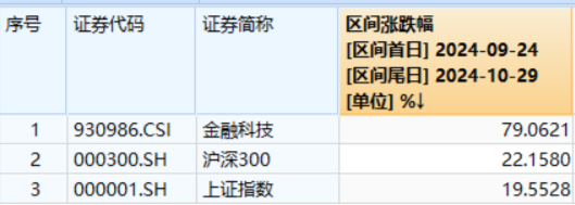来源:Wind,统计区间2024.9.24-2024.10.29。中证金融科技主题指数2019-2023年年度涨跌幅分别为:48.18%、10.46%、7.16%、-21.40%、10.03%。指数过往业绩不预示未来表现。注:需要特别提醒的是,近期市场波动可能较大,短期涨跌幅不预示未来表现,基金投资可能产生亏损。请投资者务必根据自身的资金状况和风险承受能力理性投资,高度注意仓位和风险管理。