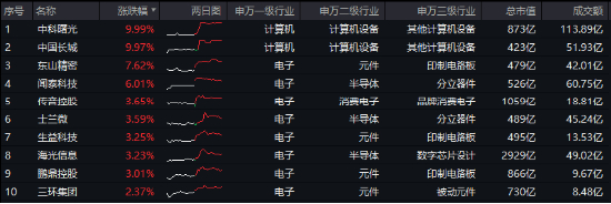 今日,苹果、华为均有大消息,AI浪潮再度袭来,电子板块逆市活跃!聚焦电子50指数涨幅前10大成份股,中科曙光、中国长城涨停,股价联袂刷新年内新高,东山精密涨超7%,闻泰科技涨逾6%,传音控股、士兰微、生益科技、海光信息、鹏鼎控股涨超3%。