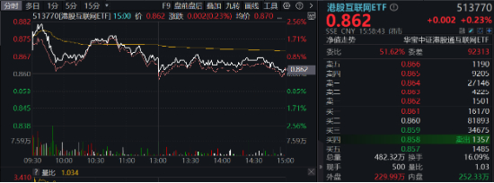 热门ETF方面,重仓港股互联网龙头的港股互联网ETF(513770)早盘高开上冲,场内价格一度涨超2%,后随市回落,收涨0.23%,成交额4.2亿元,环比放量79%。