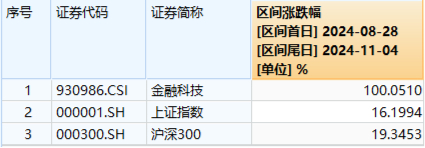 时间拉长来看,受益于市场交投的持续回暖以及华为鸿蒙、金融IT、移动支付等题材的火爆,兼具“金融+科技”属性的金融科技板块已由底部翻倍增长!Wind数据显示,中证金融科技主题指数自8月28日阶段低点至11月4日已累计反弹100%,同期上证指数、沪深300指数则分别上涨16.2%、19.35%,金融科技板块持续超额表现。
