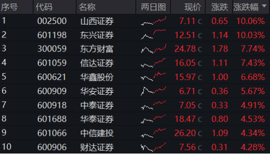 券商“来势汹汹”,全天走势较强,东兴证券早早封住涨停,山西证券尾盘急拉触板,“券茅”东方财富表现不俗,收涨7.74%,并以355.16亿元成交额再度登上A股榜首。此外,信达证券、华鑫股份、华安证券、中泰证券、华泰证券等涨幅居前。