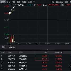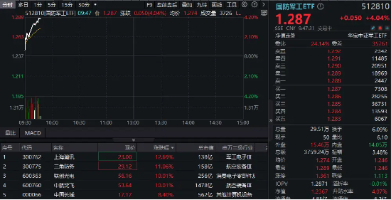 11月5日早盘,国防军工强势爆发,领涨全市场!国防军工ETF(512810)跳空高开,直线飙升逾4%,场内最高价格触及1.289元,创2023年3月16日以来新高!