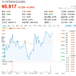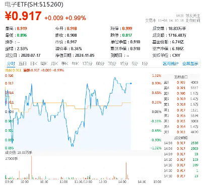 热门ETF方面,一基双拼“半导体+消费电子”的电子ETF(515260)今日上演过山车行情,振幅2.53%,场内价格一度上探1.21%,现涨0.99%,实时成交额超1700万元。