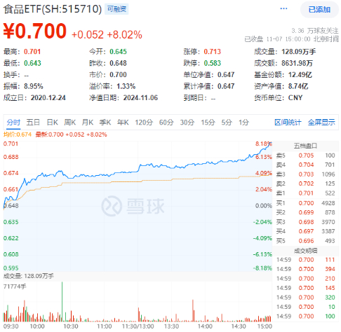 三、势如破竹!标的指数11只成份股涨停,食品ETF(515710)飙涨8.02%!资金跑步进场