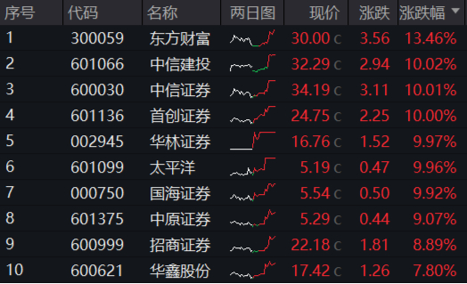 全球焦点靴子落地,不确定性极大消除,今日A股牛气冲天,午后“旗手”显著发力,“一哥”中信证券直线涨停,再创历史新高!截至收盘,中信证券、中信建投、首创证券等6股强势封板,“券茅”东方财富收涨13.46%,全天成交额597.17亿元,又双叒一次登上A股成交榜首,A股单日成交额TOP10还有中信证券、第一创业两只券商股,显示板块交投热度十分高。