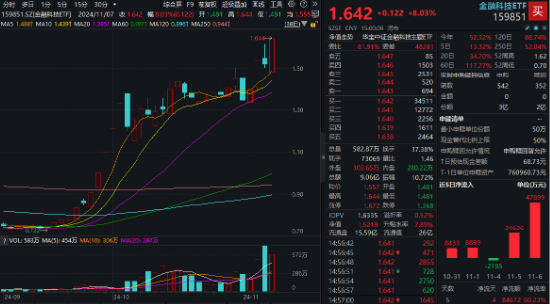 热门ETF方面,金融科技ETF(159851)低开高走,午后单边上攻场内价格收涨8.03%,最新收盘价为1.642元再创历史新高!全天成交额超9亿元,交投维持高度活跃!资金面上,金融科技ETF(159851)前一日已有近5亿元资金埋伏!