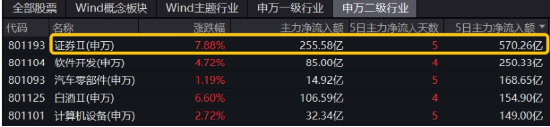 时间拉长至近5日,证券板块持续获资金增仓,合计获资金净流入570.26亿元,同样高居各行业断层第一,显示资金面对券商板块后市表现持续看好。
