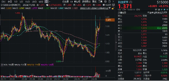 热门ETF方面,代表A股科技龙头行情的科技ETF(515000)全天红盘震荡,场内价格逆市上涨0.37%,收盘价刷新近17个月以来高点!全天成交额超2亿元,交投维持高度活跃。