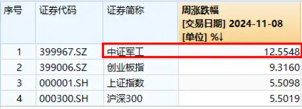 当周(11月4日-8日),国防军工ETF(512810)跟踪的中证军工指数累涨12.55%,大幅跑赢沪指、创指及沪深300指数。板块交投活跃度骤升,国防军工ETF(512810)单周累计成交6.12亿元,创2016年8月22日上市以来新高!