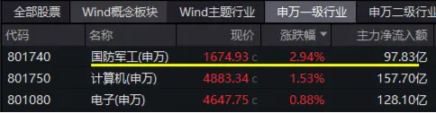 国防军工板块领涨全市场!板块内卫星互联网概念闪耀全场,军工信息化、航空航天等多题材联手助攻。主力资金大手笔“进货”,全天净买入国防军工行业逾97亿元,金额居31个申万一级行业第三。