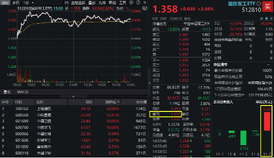 场内热门国防军工ETF(512810)早盘一度冲击4%,最高价触及1.372元,创2022年8月24日以来新高!场内最终收涨2.88%,全天成交1.18亿元,连续4日成交额突破亿元。值得关注的是,前一日国防军工ETF(512810)短暂调整期间,3525万元逢跌净申购,场内资金流向由出转进,反映市场看好板块新一轮反弹。