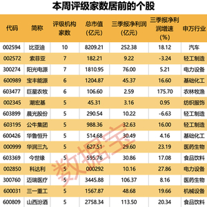 机构关注度最高的是比亚迪,共10家机构评级;其次,索菲亚、阳光电源均有7家机构评级。另外,宝丰能源、巨星农牧、潮宏基、晨光股份、公牛集团等大消费股均在榜。上述多只个股三季报业绩较为亮眼。