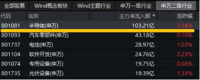资金面上,半导体获主力资金青睐,截至发稿,已吸金103.21亿元,高居所有申万二级行业断层第一!