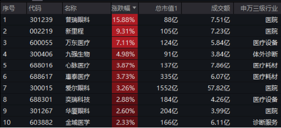 哪些成份股强势带动板块整体上涨?眼科、民营医院及医疗器械概念股涨幅居前:普瑞眼科盘中一度20CM涨停, 收涨15.88%!权重股爱尔眼科大涨3.26%。新里程盘中10%涨停,尾盘开板收涨9.31%创逾1年新高;万东医疗大涨7.11%。主要拖累则集中在CXO板块,博腾股份跌2.88%,九洲医疗、泰格医药、康龙化成、昭衍新药集体收跌。