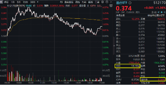 伴随医药医疗反攻行情,医疗ETF(512170)成交量骤增,全天成交14.18亿元,较前一日(8.5亿元)放量近7成,创近1个月新高。午后震荡走低区间场内开始溢价交易,收盘溢价率仍达0.38%,反映买盘资金相对强势。