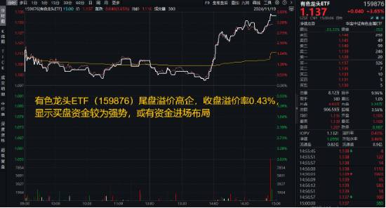 热门ETF方面,揽尽有色金属行业龙头的有色龙头ETF(159876)全天逆市活跃,尾盘再度冲高,场内价格收盘猛拉3.65%。值得注意的是,有色龙头ETF(159876)尾盘溢价高企,收盘溢价率0.43%,显示买盘资金较为强势,或有资金进场布局!