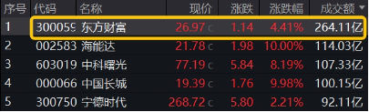 值得注意的是,今日“券茅”东方财富再度登上A股成交额榜首,单日成交额达264.11亿元,是排名第二海能达(114.03亿元)成交额的两倍有余。