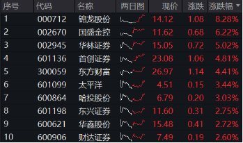 午后,“旗手”券商突发异动,板块个股集体拉升,国盛金控上探触板,收涨逾6%,锦龙股份亦冲击涨停,收涨超8%;此外,华林证券涨超5%,首创证券、东方财富双双涨超4%,太平洋、哈投股份、东兴证券、财达证券等涨幅居前。