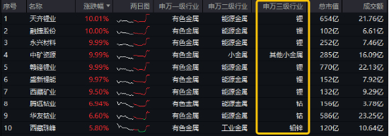 今日,有色金属领涨两市,锂业股掀涨停潮!天齐锂业、融捷股份、赣锋锂业、中矿资源、永兴材料、盛新锂能6只锂矿股涨停,西藏矿业涨超9%,腾远钴业、华友钴业、西藏珠峰等个股大幅跟涨!