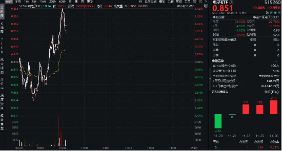今日(11月27日)电子板块奋力上冲截至发稿,寒武纪-U领涨6.71%,鹏鼎控股上涨4.74%,立讯精密上涨4.04%。热门ETF方面,一基双拼“消费电子+半导体”的电子ETF(515260)场内价格盘中上探1.42%,现涨0.95%