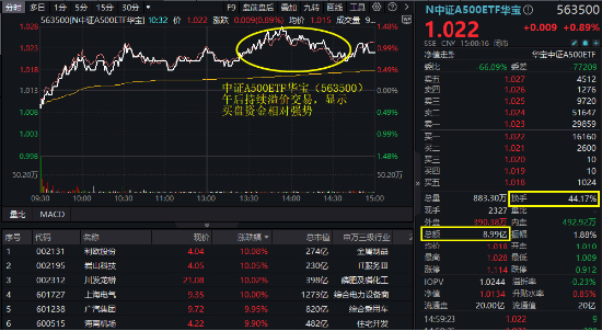 行情方面,中证A500ETF华宝(563500)早盘低开后快速拉升,午后一度摸高1.48%,并伴随溢价交易,显示买盘资金相对强势!场内最终收涨0.89%报1.022元,价格高居沪市10只A500ETF首位!
