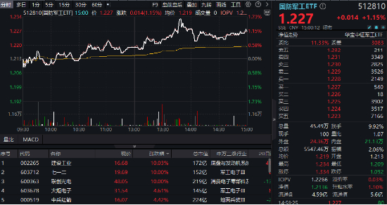 连歇两日后,国防军工板块开启反弹,场内热门国防军工ETF(512810)全天震荡拉升,午后上探1.65%,场内价格收涨1.15%,放量成交5547万元。