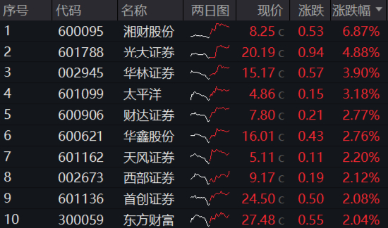 券商股集体走强,截至收盘,板块50家上市券商除国盛金控微跌0.39%外,其余全线收红,半数个股涨逾1%,湘财股份盘中多次触板,收盘涨近7%,光大证券涨近5%,华林证券、太平洋涨超3%,财达证券、华鑫股份、天风证券、东方财富等涨幅居前。