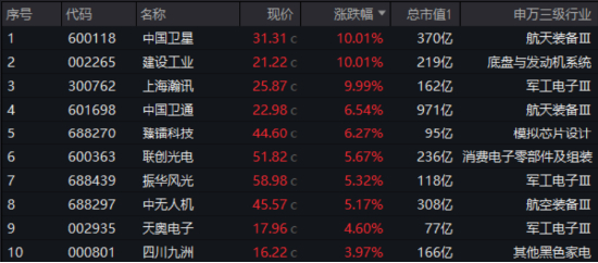 国防军工板块全线反弹,中证军工指数80只成份股中70只收涨,商业航天、军工信息化、低空经济等热门题材股涨幅居前,建设工业、中国卫星、上海瀚讯等3股涨停,其中建设工业斩获7天6板。