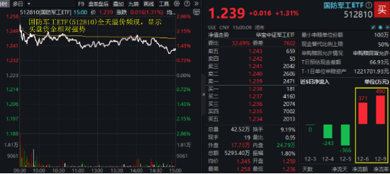 值得关注的是,国防军工ETF(512810)全天溢价频现,显示买盘资金相对强势。此前2个交易日,已有资金连续进场净申购,金额合计超860万元。