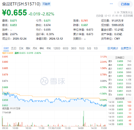 连涨3天后,吃喝板块回调。反映吃喝板块整体走势的食品ETF(515710)早盘低开后持续下挫,最终场内价格收跌2.82%。