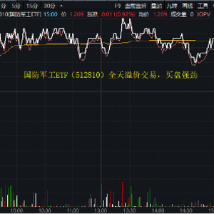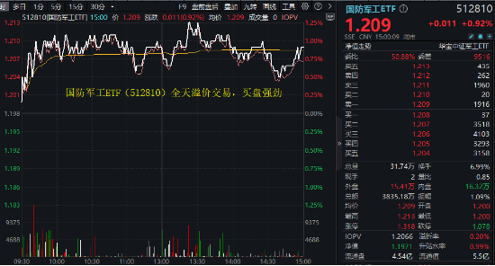 央企市值管理新规落地,中字头军工央国企今日(12月18日)集体反弹,带动国防军工板块回暖,场内热门国防军工ETF(512810)全天红盘震荡,持续溢价交易,显示买盘尤为强劲。截至收盘,国防军工ETF(512810)场内价格收涨0.92%报1.209元,成交额3835万元,换手率近7%。
