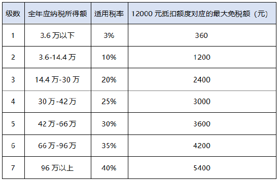 每人每年缴纳个人养老金额度上限为12000元,按照下图,根据每人的全年应纳税所得额,最高可省5400元的税。