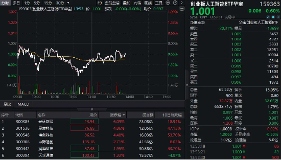 热门ETF方面,全市场首只的创业板人工智能ETF华宝(159363)场内窄幅震荡整理,实时成交额超6500万元,换手率超13%,交投活跃度居全市场AI主题类ETF前列。盘中持续溢价交易,资金持续净流入,创业板人工智能ETF华宝(159363)获资金实时净申购1700万份!